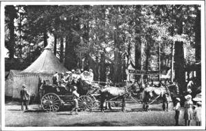 This is camp life in its most elementary aspect. From that the conditions of tent and bungalow life in the Valley range up to the finely equipped and organized camps, where the visitor may enjoy all the advantages and luxuries of comfortable hotel life, while at the same time living close to the ground. The established camps at present are Awahnee, El Capitan, Yosemite Camp, Lost Arrow and Camp Curry. The affairs of each camp are managed from its own central office, a building where mail is received and the interests of the campers are looked after. The daily life of these communities is full of incident. Each camp has its entertainments and its gala performances. One has a fine, large bathing pavilion and plunge; another, a festival hall. Moving pictures are exhibited in the evenings; there are lectures and concerts; and a large, well equipped dancing pavilion makes the hours fly fast for young people. Communication between the camps is easy, for there are auto-buses, “jitneys,” as well as ponies and burros, and things are stirring actively among the camps most of the time. No one need lack for entertainment. Between the single tent in a remote part of the Valley and the populous camp community there is a wide range for choice, and variety of conditions enough to make everyone happy.