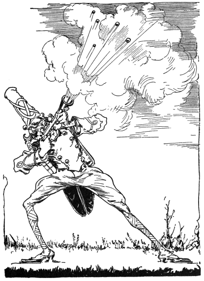 THREE days later the Grand Army of Oogaboo assembled in the square in front of the royal palace. The sixteen officers were attired in gorgeous uniforms and carried sharp, glittering swords. The Private had picked his gun and, although it was not a very big weapon, Files tried to look fierce and succeeded so well that all his commanding officers were secretly afraid of him.