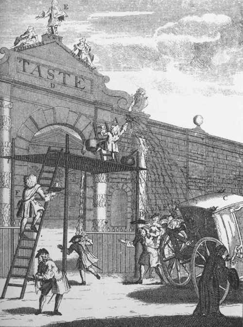 "In justice to Mr. Hogarth, the engraver of this plate declares to the public he took the hint of 'The Butifyer' from a print of Mr. Pope whitewashing Lord Burlington's gate, and at the same time bespattering the rest of the nobility."