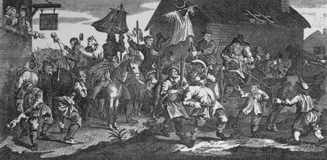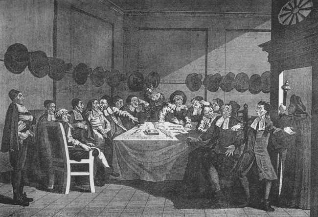 [98] Religious Ceremonies of all Nations, published at Amsterdam in 1735. He entitles this print, "Le Serment de la Fille qui se trouve enceinte." On the same page he has introduced a copy from Sympson's print of orator Henley christening a child, and calls it "Le Baptême Domestique."