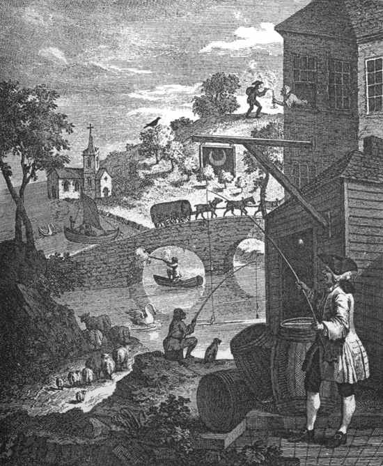 "Sir,—When genius is made subservient to public good, it does honour to the possessor, as it is expressive of gratitude to his Creator, by exerting itself to further the happiness of His creatures. The poignancy and delicacy of your ridicule has been productive of more reformation than more elaborate pieces would have effected. On the apprehension of opening the distillery, methinks I hear all good men cry, Fire!—it is therefore the duty of every citizen to try to extinguish it. Rub up, then, Gin Lane and Beer Street, that you may have the honour and advantage of bringing the two first engines to the fire; and work them manfully at each corner of the building; and instead of the paltry reward of thirty shillings allowed by Act of Parliament, receive the glorious satisfaction of having extinguished those fierce flames which threaten a general conflagration to human nature, by pouring liquid fire into the veins of the now brave Britons, whose robust fabrics will soon fall in when these dreadful flames have consumed the inside timbers and supporters.—I am, Sir, yours, etc.,