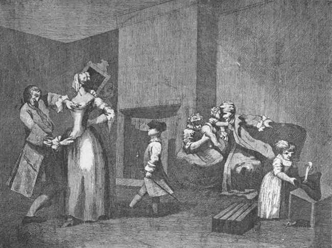 [111] This etching is so nearly a fac-simile of the original, that when it was brought home Hogarth mistook it for his own drawing, which, considering of no value, he threw into the fire, whence it was snatched by Mrs. Lewis, though not before the paper was scorched.