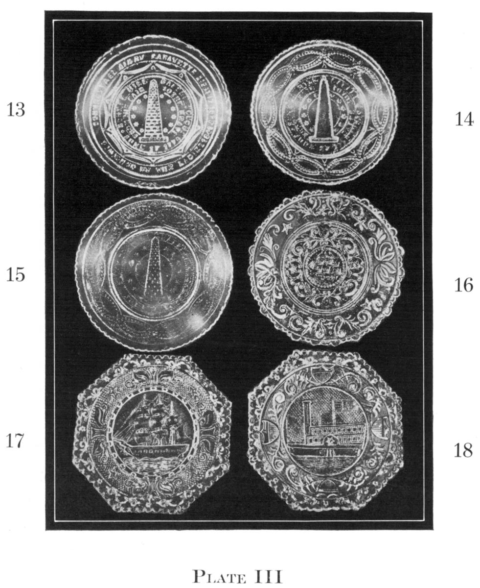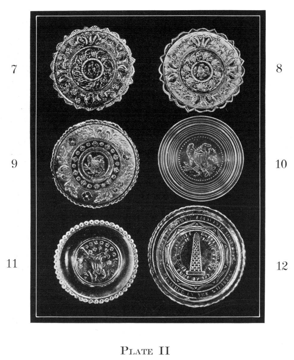 The invention of the stamp machine increased the production and the little plates came away from the molds with clearer and sharper edges and brilliancy of detail. The first cup plates made were conventional or geometrical patterns. The author owns one one-half inch thick with pontil, a rare example of the first process.