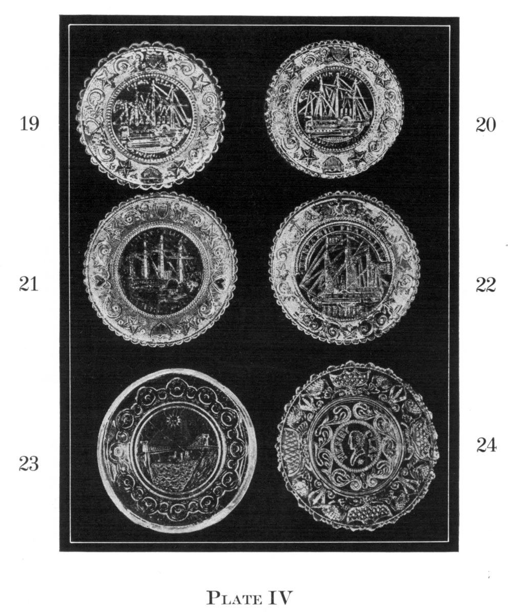 17. The Constitution—Large square rigged ship in center, inner border type of No. 7, octagonal plate of exquisite workmanship. Note cover design of this book. This cup plate represents the acme of Sandwich glass designing. It was issued when feeling was running high against the probable “junking” of the Constitution in hopes that public opinion might change the fate of the old sailing vessel.