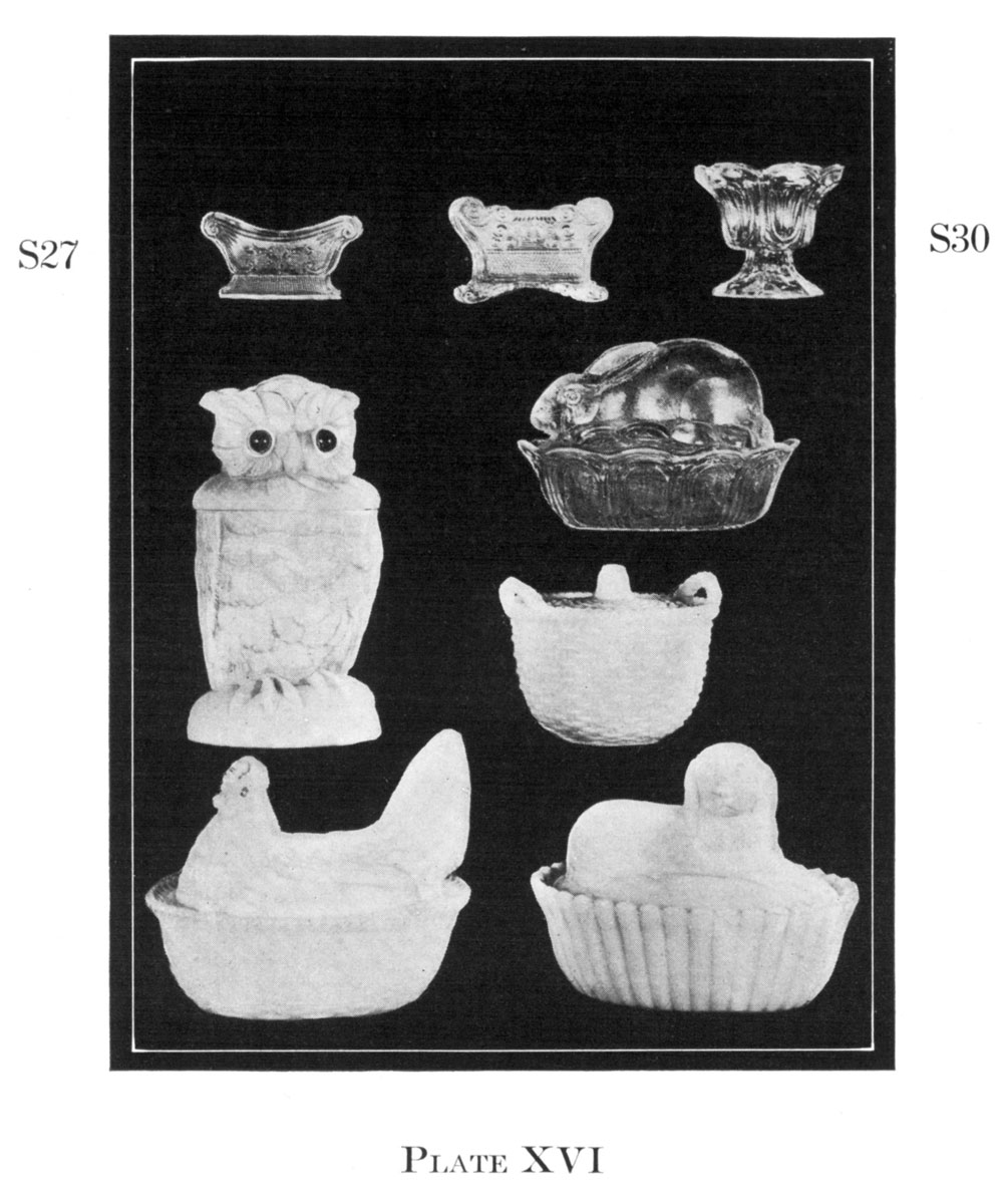 For the West Mustard Company about 1870 the Sandwich works made a number of designs consisting of chickens and other animals on nests of semi opaque white glass. Many of these had glass eyes and the less common ones found to-day are in colors, a 64remarkable blue predominating. These were filled with their products, labeled with a red and orange label and sold to the public destined later to become useful receptacles. Many collectors of these objects confuse the marbled glass which comes in mauve and white and ocre and white in many designs similar to the above with the Sandwich of this late period. This marbled glass in Whieldon effects was made at Phoenixville, Pa., and may be put in the same class as the advertising of the West Mustard Co. During this last period of the Sandwich Glass Works their products became cheapened to meet the demand of commercial advertising and an endless number of cheap glass premiums were sent out to all parts of the country in the era just preceding the soap wrapper and the patent medicine man.