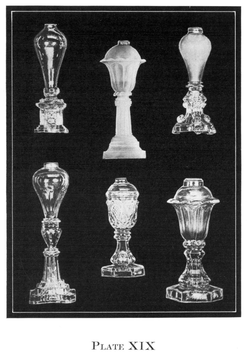 3. The collector of American glassware finds a very handsome type of candlestick with blown bobèche top and molded base. It is safe to say that these tops were 67imported from England for use at the Sandwich works. They are only found on the most expensive sticks of the period, and are identical with English candlesticks of the same time, except for the typical Sandwich pedestal and base, fused to the blown bobèche. We know that elaborate lamp bowls were imported and combined with Sandwich glass bases and later joined with brass standards to marble bases, thus it is safe to assume that many of the elaborate candlesticks are in part of similar origin.