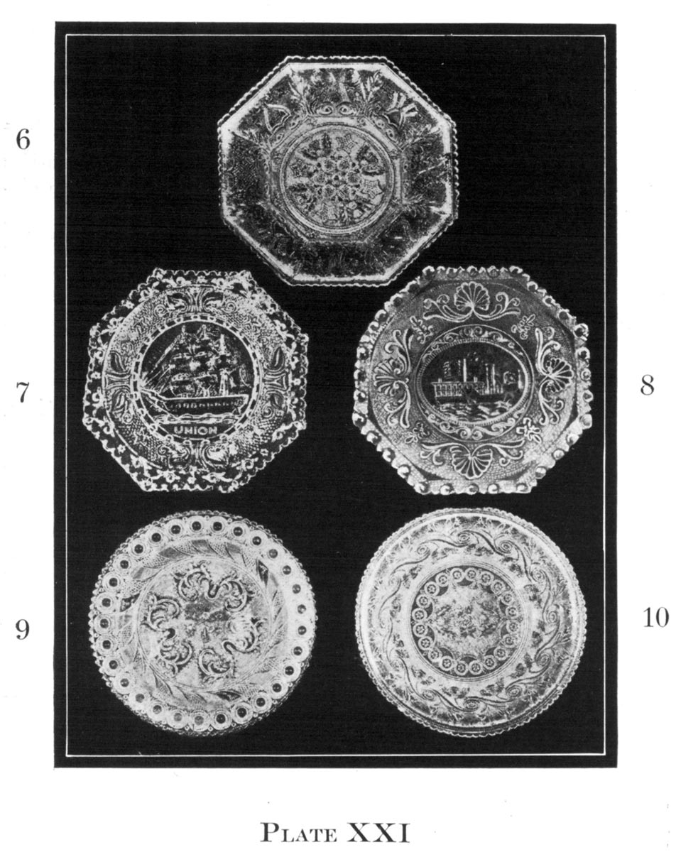 7. Octagon dish, 7 inch, C, with the ship “Constitution” in the center and the word “Union” below, typifying a union sentiment against the junking of “old ironsides.” One of the rarest pieces of early Sandwich glass in existence.
