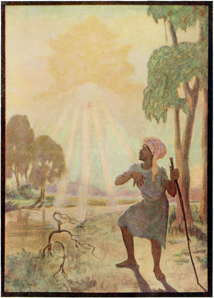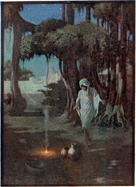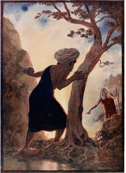 So when the night came, the mighty king remembered his promise to the monk, and at dusk he wrapped his head in a black veil, took his sword in his hand, and went to the great cemetery without being seen. When he got there, he looked about, and saw the monk standing under the fig-tree and making a magic circle. So he went up and said: "Monk, here I am. Tell me what I am to do for you."