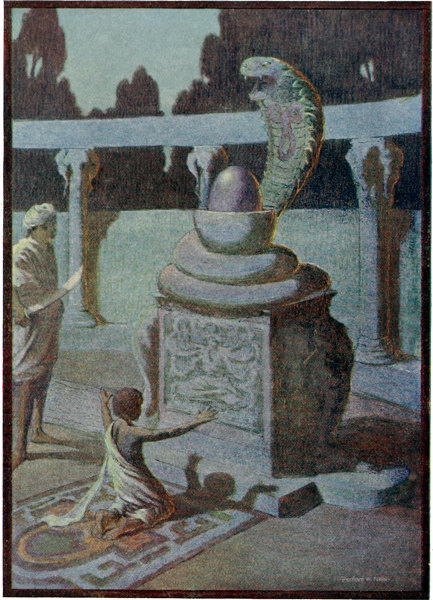 Now one day the monk came to court, gave the king a piece of fruit as usual, and went away. But on this day the king gave the fruit to a pet baby monkey that had escaped from his keepers, and happened to wander in. And as the monkey ate the fruit, he split it open, and a priceless, magnificent gem came out.