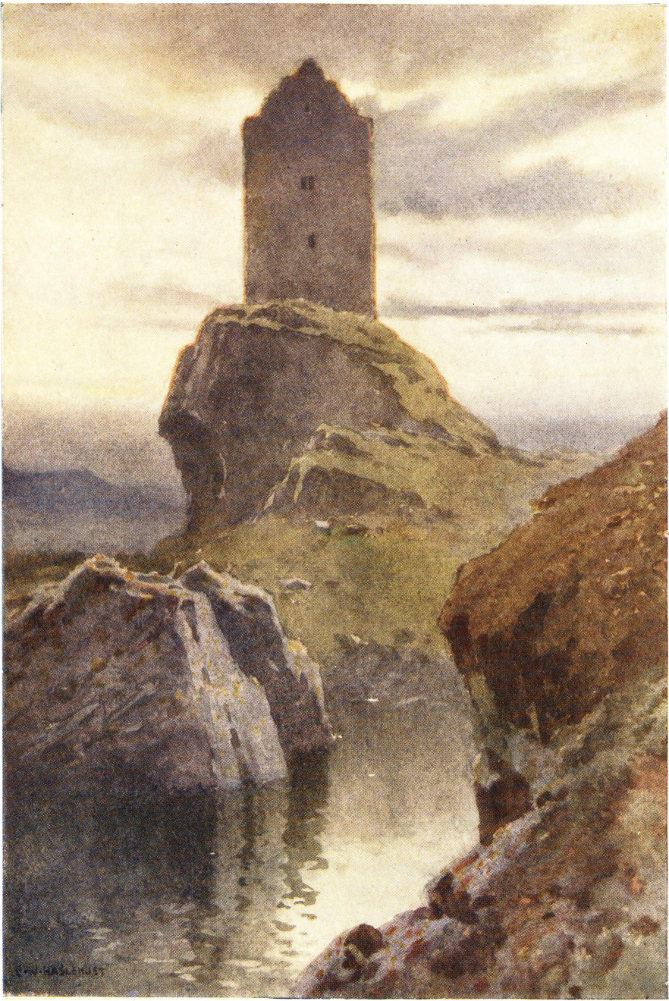 Only a few miles away, beside the stark and far-seen old keep of Smailholm, was the farm of Sandyknowe, leased from Scott of Harden by his grandfather Robert Scott, to which, between the ages of three and eleven, the little boy from Edinburgh came annually for holidays. Everyone remembers the lines that record the impression made on his youthful mind by his “barren scene and wild”—by the tall, grey, weather-beaten tower looking down from its rock upon the lone lochan, and out and away over many scenes of Border romance to “the distant Cheviots blue”; and of the legends of foray and strife that were told in the boy’s wondering ears by the “aged hind”, and that took shape afterwards in “The Eve of St. John” and other tales of the Master.