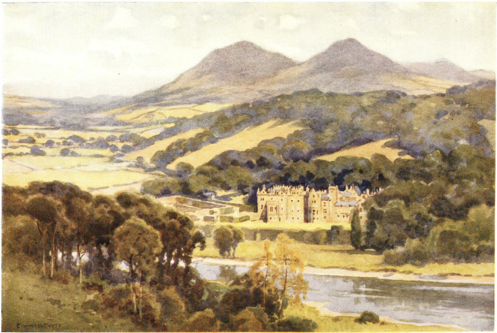 This Bemerside Hill is a “Mount of Vision” from which all the chief shrines and high places of the Scott Country can be surveyed, at least with the mind’s eye. Abbotsford itself, if not in actual view, can be mapped into the scene by direction and position. Out of sight, directly under the brow of the hill, is the ancient square fortalice, with later buildings attached, and grounds stretching down towards the Tweed, where Haigs have been resident for seven centuries. They were benefactors of Melrose when Alexander III was king, and when Thomas the Rhymer was their neighbour and wellwisher, and uttered the prophecy that has so mightily helped its own fulfilment: