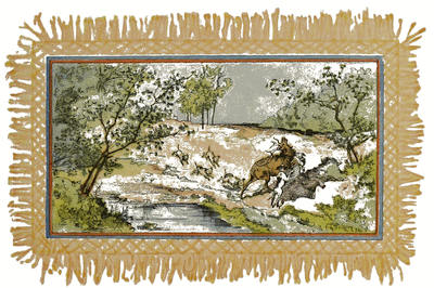 C’était au commencement de l’automne, un jour férié,—car je les observais comme des intervalles de relâche dans le travail;—j’avais amené ma famille à notre lieu ordinaire de récréation, et nos jeunes musiciennes commençaient leur concert habituel. Pendant que nous nous occupions ainsi, nous vîmes un cerf passer en bonds rapides à vi[33]ngt pas environ de l’endroit où nous étions assis. Au pantèlement de ses flancs, il semblait pressé par les chasseurs. Nous n’avions guère eu le temps de songer à la détresse du pauvre animal, lorsque nous aperçûmes les chiens et les cavaliers arriver à toute vitesse à quelque distance derrière et prendre le même sentier qu’il avait pris. Je fus sur-le-champ d’avis de rentrer avec ma famille; mais la curiosité, ou la surprise, ou quelque motif plus caché, retinrent ma femme et mes filles à leurs places. Le chasseur qui courait en avant passa devant nous avec une grande rapidité, suivi de quatre ou cinq autres personnes qui semblaient emportées d’une hâte égale.