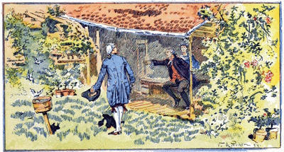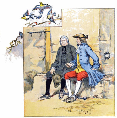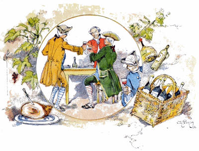 Comme nous demeurions près de la route, nous avions souvent la visite du voyageur ou de l’étranger, qui goûtaient notre vin de groseille, pour lequel nous jouissions d’une grande réputation; et je déclare avec la véracité de l’historien que je n’ai jamais su qu’aucun d’eux y ait trouvé à redire. Nos cousins également, jusqu’au quarantième degré, se rappelaient[5] tous leur consanguinité sans nullement recourir au bureau des généalogies, et venaient très fréquemment nous voir. Quelques-uns ne nous faisaient pas grand honneur par ces revendications de parenté, car nous avions dans le nombre l’aveugle, le manchot et le boiteux. Cependant ma femme insistait toujours sur ce qu’étant la même chair et le même sang, ils devaient s’asseoir avec nous à la même table. De sorte que, si nous n’avions pas autour de nous des amis très riches, nous en avions généralement de très heureux; car cette remarque se trouvera juste dans tout le cours de la vie, que plus le convive est pauvre, plus il est content d’être bien traité; et de même que certaines gens s’extasient sur les couleurs d’une tulipe ou sur l’aile d’un papillon, moi[6] j’étais, par nature, admirateur des visages heureux.