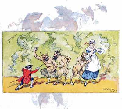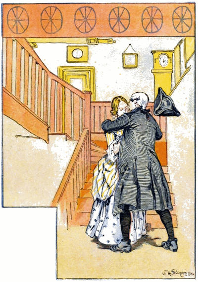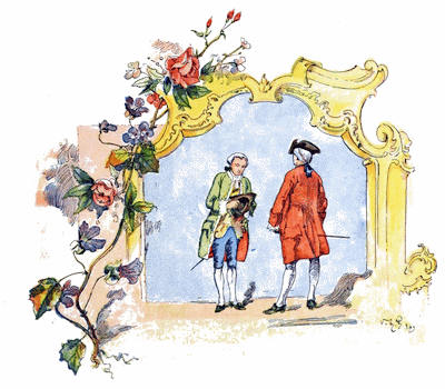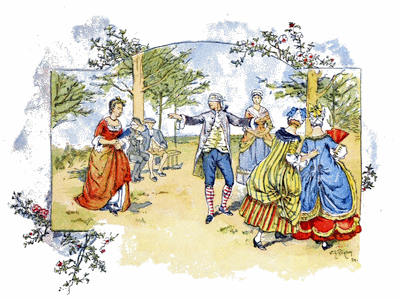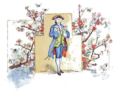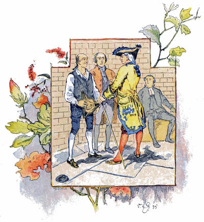 En dernier lieu, un jeune gentilhomme, d’apparence plus distinguée que les autres, s’avança, et, nous ayant regardés un instant, au lieu de poursuivre la chasse, il s’arrêta court, donna son cheval à un serviteur qui suivait, et s’approcha de nous avec un air d’insouciante supériorité. Il semblait n’avoir pas besoin d’être annoncé, et il allait saluer mes filles comme quelqu’un qui est certain d’être bien reçu; mais elles avaient appris de bonne heure à déconcerter d’un regard la présomption. Il nous fit alors savoir que son nom était Thornhill, et qu’il était possesseur du domaine qui s’étendait à quelque distance autour de nous. En conséquence, il se mit en devoir de saluer la partie féminine de la famille, et tel est le pouvoir de la fortune et des beaux habits qu’il n’éprouva pas un second refus. Comme son abord, quoique suffisant, était facile, nous devînmes bientôt plus familiers, et, apercevant des instruments de musique déposés près de nous, il demanda qu’on lui fît la faveur de chanter. Peu partisan de liaisons si disproportionnées, je fis signe de l’œil à mes filles pour les empêcher de consentir; mais un autre signe de leur mère détruisit l’effet du mien, si bien qu’elles nous donnèrent, d’un air joyeux, un morceau à la mode de Dryden. M. Thornhill parut ravi du choix et de l’exécution; puis il prit la guitare lui-même. Il ne jouait que très médiocrement; néanmoins, ma fille aînée lui rendit ses applaudissements avec usure et l’assura qu’il tirait des sons plus hauts que ne le faisait son maître même. A ce compliment il fit un salut, auquel elle répondit par une révérence. Il loua son goût; elle vanta son jugement. Un siècle n’aurait pas mieux noué leur connaissance. Cependant la vaniteuse mère, aussi heureuse,[35] insistait de son côté pour que son seigneur entrât et goûtât un verre de sa groseille. Toute la famille semblait avoir à cœur de lui plaire: mes filles essayaient de l’intéresser sur les sujets qu’elles croyaient avoir le plus d’actualité, tandis que Moïse, au contraire, lui soumettait une ou deux questions à propos des anciens, qui lui valurent la satisfaction de se voir rire au nez; mes tout petits n’étaient pas moins empressés et s’attachaient avec amour à l’étranger. Tous mes efforts suffisaient à peine à empêcher leurs doigts sales de manier et de ternir les galons de ses habits et de lever les pattes de ses poches pour voir ce qu’il y avait dedans. A l’approche du soir, il prit congé; mais pas avant d’avoir demandé la permission de renouveler sa visite, ce que nous lui accordâmes avec la plus grande facilité, car il était notre seigneur.
