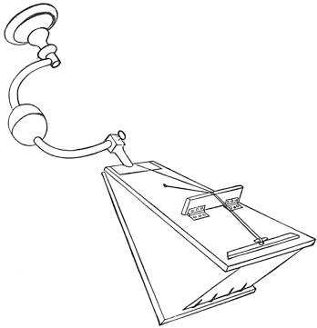 The copying easel is placed perpendicularly in front of, and perfectly parallel with, the camera. As a mirror is used, the camera is sideways to the object, not facing it, as in copying direct.