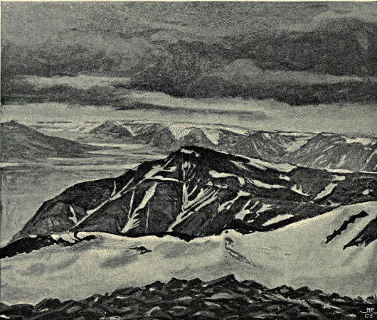 “The view fully came up to our expectations. North-westward, far as the eye could reach, spread endless hills and plains of snow, only broken here and there by occasional mountain peaks standing more or less free. Among these, several remote mountains, probably surrounding the southern shore of Wijde Bay, deserve mention. Further round in the north-east a row of[43] peaks stood up against the horizon. Mount Chydenius was the most northerly and highest of these great mountains.[5] We overlooked the whole of Wybe Jans Water from Whale’s Point and Whale’s Head to its inmost recess near the White Mountain. Many mountains surrounded by ice reared themselves in the west. The view over Hinloopen Strait was hindered by thick mist, which appeared to lie only over this depression and its bordering hills, as so often happens.