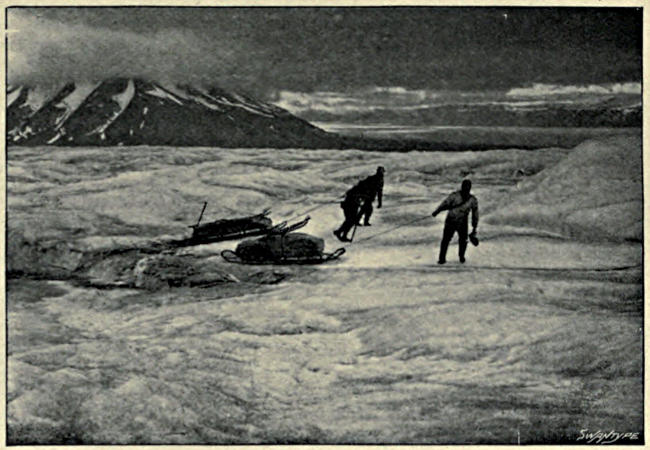 Our preparations being completed, we set forth up the Nordenskiöld Glacier, toward the unknown interior, on the morning of July 13. The first struggle up the steep, moraine-faced front of the glacier involved all our forces. The stones, lying upon ice, were loose and large. They slipped from under, or fell upon us. We took one sledge at a time and lightened it of half its burden, but still it was hard to drag. It wedged itself against rocks when pulled forward, but never seemed to find a stone to stop its backsliding. Our aim was to reach a tongue of hard snow in the upper part of a gully. Coming to it from the side, the sledge swung across and almost upset us all. At last we reached the top, returned for the second sledge, then (two or three times) for the bundles, and so finally gained our end after hours of toil. Once on more level ice, things went better, though not well. To begin with, the sledges were badly loaded and had to be rearranged. Then, though the surface of the ice sloped but[16] gently, it was very lumpy and the lumps turned the sledges this way and that. Garwood and I pulled one, the two men the other. Perspiration ran off us. Our estimate of the possible length of the day’s march diminished.