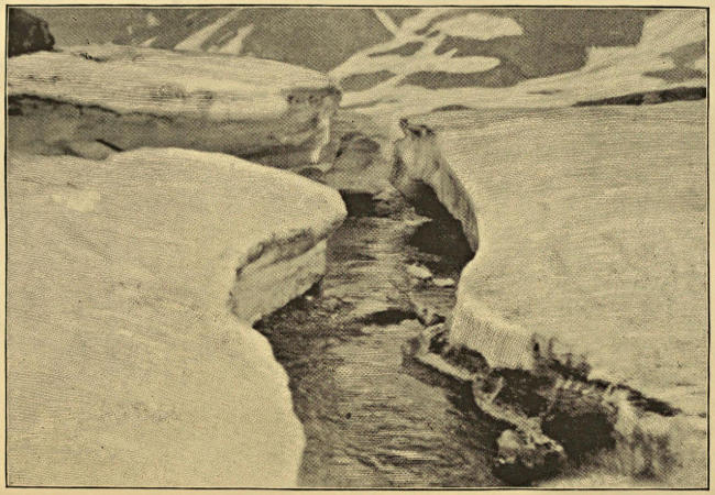Garwood had observed a curious piece of glacier a few hundred yards away from camp. It was mounded in a peculiar manner, calling for investigation. On approaching it, the mounds were perceived to be arches of ice, barrel vaults[52] perfectly regular in form. Their origin was presently self-explained. A wide and deep stream of surface drainage-water habitually flows near the foot of the Terrier. Reaching a level place, the speed of flow is reduced so that the surface becomes frozen over in cold weather. Snow falls upon the ice thus formed, and a roof is made, the remains of which, even at this advanced period of the summer, were two feet thick or more. The glacier in its onward movement is compressed between the Terrier and the De Geer range opposite, and every portion of it feels this compression, which, operating on the frozen roof of the river, bends it up into an icy tunnel of regular form. By degrees parts of the tunnel fall in, and thus the detached arches are left. On the King’s Bay Glacier we afterwards saw more arches of similar origin. It is to the strength of the arctic winter’s frost, rather than to the amount of the annual snowfall, that Spitsbergen glaciers owe their peculiar phenomena, to which the glaciers of high mountain regions in the temperate and tropical parts of the world present no parallels.