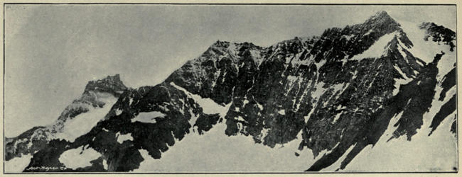 Tearing ourselves away from the summit and its entrancing view, when at last we were almost frozen stiff, we retreated a few yards down the east face into a little hollow, sheltered from the wind and open to the tepid sun. There a frugal luncheon was eaten and pipes duly smoked, and there we left our cards in a crack, for there were no loose stones out of the snow wherewith to build a cairn, nor, if there had been any, was there room enough on the summit for a cairn to stand. In such raw atmosphere, however, motion is needful for enjoyment, so that neither of us was unwilling to commence the descent. Garwood’s notion of traversing the whole length of Mount Hedgehog’s summit-ridge to its north end and descending by another west arête from that point was silently abandoned. With the mountain in good condition it might be accomplished and enjoyed, but the iced rocks made the attempt not worth consideration. By the way that we came up by the same must we return.