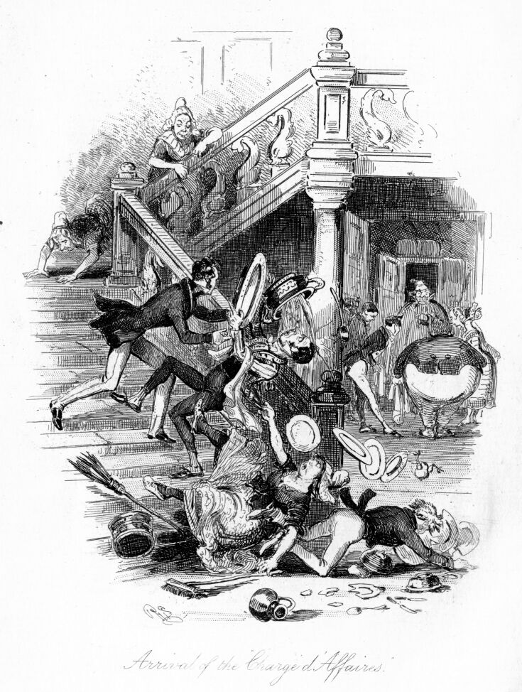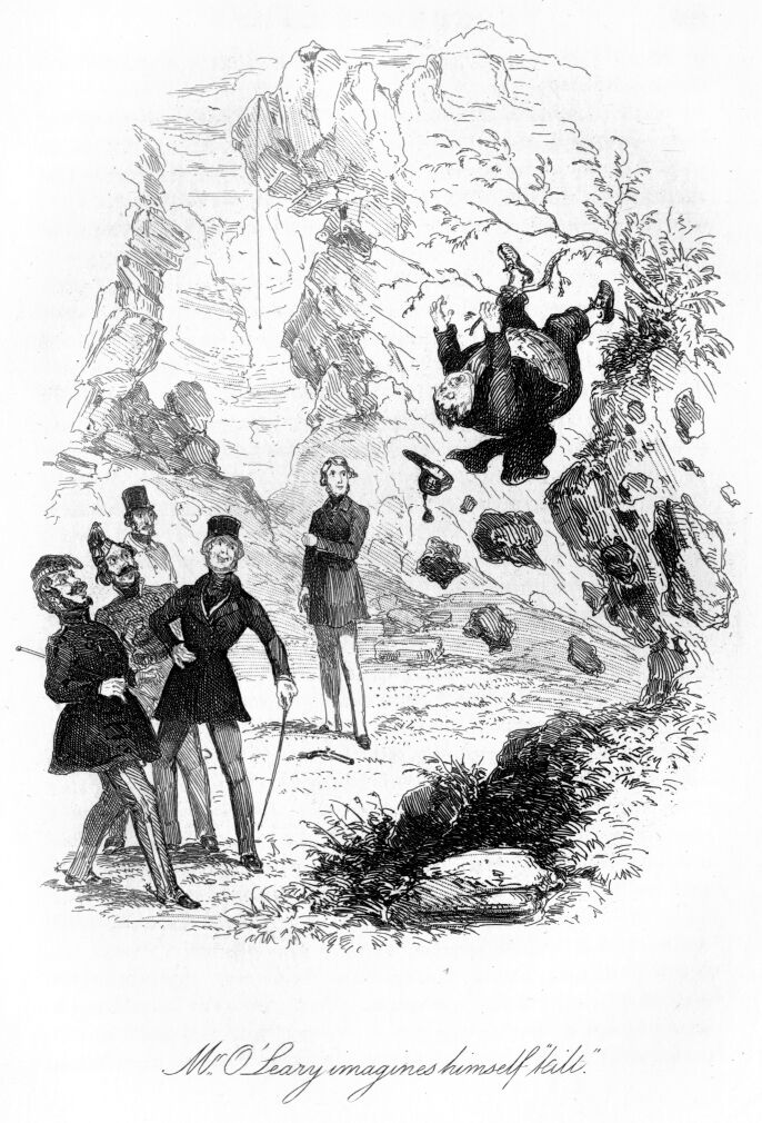 At this moment I remembered I had brought with me my cane, which, from a perhaps pardonable vanity, I was fond of parading. It was a present from the officers of my regiment—many of them, alas, since dead—and had a most splendid gold head, with a stag at the top—the arms of the regiment. This I would not have lost for any consideration I can mention; and this now was gone! I looked around me on every side; I groped beneath the table; I turned the sleeping sots who lay about in no very gentle fashion; but, alas, it was gone. I sprang to my feet and only then remembered how unfit I was to follow up the search, as tables, chairs, lights, and people seemed all rocking and waving before me. However, I succeeded in making my way, through one room into another, sometimes guiding my steps along the walls; and once, as I recollect, seeking the diagonal of a room, I bisected a quadrille with such ill-directed speed, as to run foul of a Cork dandy and his partner who were just performing the “en avant:” but though I saw them lie tumbled in the dust by the shock of my encounter—for I had upset them—I still held on the even tenor of my way. In fact, I had feeling for but one loss; and, still in pursuit of my cane, I reached the hall-door. Now, be it known that the architecture of the Cork Mansion House has but one fault, but that fault is a grand one, and a strong evidence of how unsuited English architects are to provide buildings for a people whose tastes and habits they but imperfectly understand—be it known, then, that the descent from the hall-door to the street was by a flight of twelve stone steps. How I should ever get down these was now my difficulty. If Falstaff deplored “eight yards of uneven ground as being three score and ten miles a foot,” with equal truth did I feel that these twelve awful steps were worse to me than would be M’Gillicuddy Reeks in the day-light, and with a head clear from champagne.