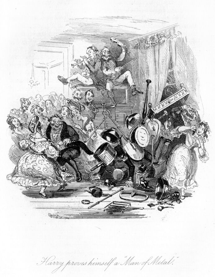 When I first returned to consciousness, I found myself lying exactly where I had fallen. Around me lay heaps of slain—the two of “ours” amongst the number. One of them—I remember he was the adjutant—held in his hand a wax candle (three to the pound). Whether he had himself seized it in the enthusiasm of my narrative of flood and field, or it had been put there by another, I know not, but he certainly cut a droll figure. The room we were in was a small one off the great saloon, and through the half open folding-door I could clearly perceive that the festivities were still continued. The crash of fiddles and French horns, and the tramp of feet, which had lost much of their elasticity since the entertainments began, rang through my ears, mingled with the sounds “down the middle,” “hands across,” “here’s your partner, Captain.” What hour of the night or morning it then was, I could not guess; but certainly the vigor of the party seemed little abated, if I might judge from the specimens before me, and the testimony of a short plethoric gentleman, who stood wiping his bald head, after conducting his partner down twenty-eight couple, and who, turning to his friend, said, “Oh, the distance is nothing, but it is the pace that kills.”