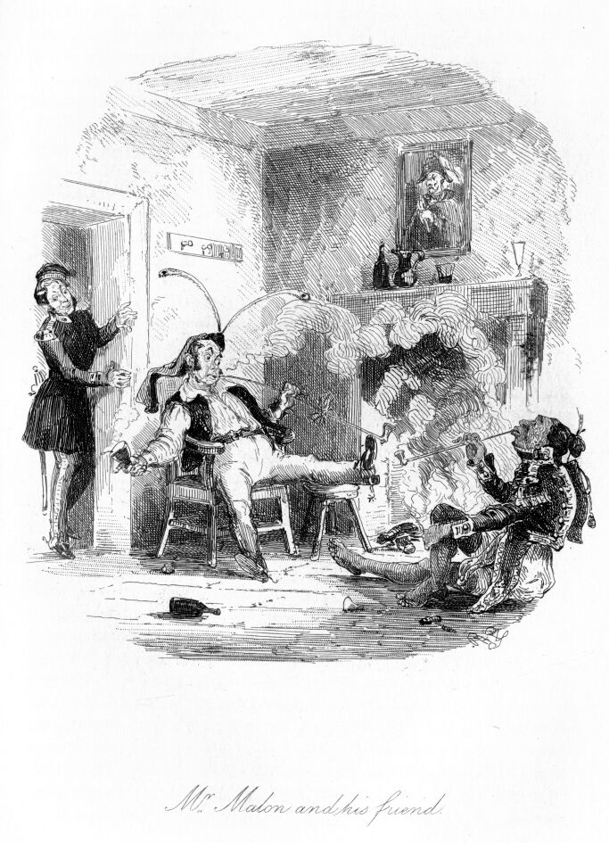 “Well, adjutant, the Colonel is right. It was no mistake! You know I sent him tickets yesterday for the theatre. Well, he returned them; this did not annoy me, but on one account, I had made a wager with Alderman Gullable, that the Colonel should see me in Othello—what was to be done? Don’t you see, now, there was only one course, and I took it, old boy, and have won my bet!”