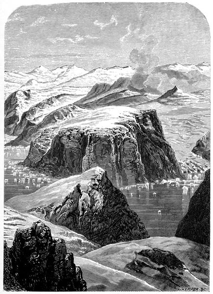 The three ships left Spithead on the 29th of May, 1875, and were all at Godhavn on the 6th of July. Nine days afterwards they left for Ritenbenk of the curious name, which is an anagram of that of Berkentin who was in charge of the Greenland department when it was founded. Here the Valorous parted company to return home after filling up with fuel at the coal quarries on the north side of Disco Island, while the two ships went to Proven to pick up Hans Hendrik, who this time left his wife and children behind him.