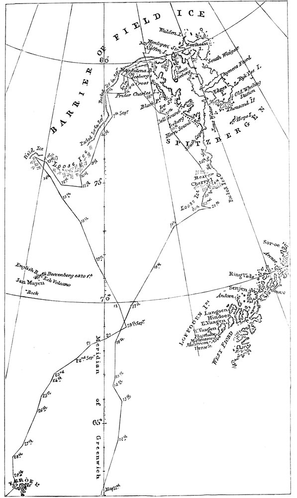 The floe on which the castaways passed the winter was about a hundred yards long and seventy-five broad. On this they voyaged down the whole length of Baffin Bay and through Davis Strait, the ice melting away and getting smaller and smaller as they drifted south, until on the 1st of April, when it was only twenty yards round, they had to take to the remaining boat, the other having been used for fuel. Once they nearly touched the shore, but the wind rose and off they were driven in the snow. When they were picked up by the sealer Tigress in 53° 35´, near the coast of Labrador, on the 30th of April, they had drifted fifteen hundred miles in the hundred and ninety-six days that had elapsed since they left the ship.