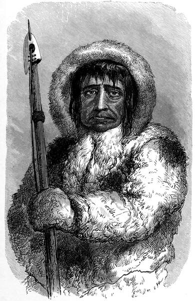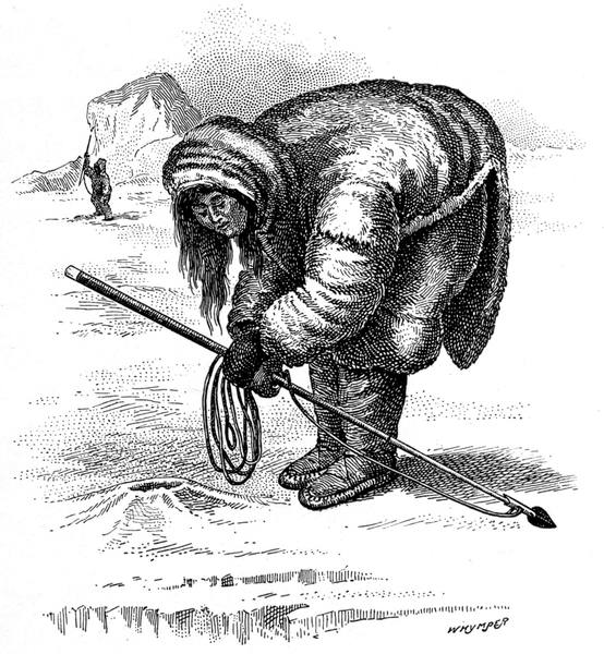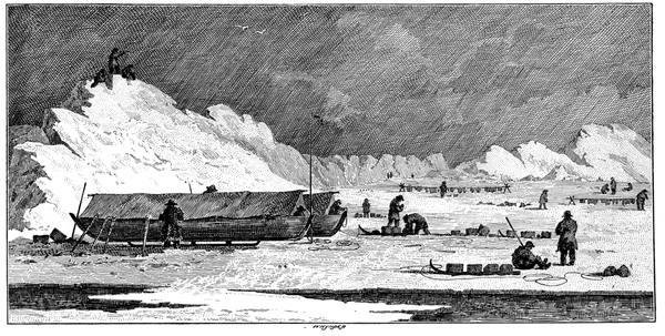 247On the ice were Tyson, with Sergeant Meyer, the steward, the cook, six sailors, and nine Eskimos, men, women, and children, including Hans and Joe. They built a house, from the materials thrown out from the ship, as a shelter; and they built snow houses as the time went on and the floe diminished. Provisions they had but few, but Hans and Joe were indefatigable. They speared seals, caught fish, trapped birds, and, sometimes, a bear would scramble up on to the ice for them to shoot—and they never missed. In short, without them the party would have starved to death.
