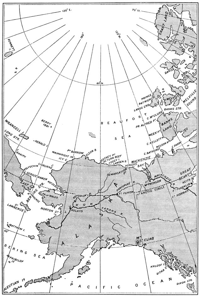 Ten days afterwards, fearing a similar fate had overtaken Aldrich's party, Lieutenant May was despatched 257to find him. As with Markham, scurvy had begun on the outward journey, and it had become so bad on the return that one of the men was being sent off to the ship when May arrived with help. It had nevertheless been a successful journey, the road being easier than that by the northern route. Aldrich had traced the continuous border of the heavy pack for two hundred miles from Floeberg Beach, rounded Cape Columbia, in 83° 7´ N., the northernmost point of Grant Land, and, along the coast trending steadily south-west, had reached longitude 85° 33´ and sighted Cape Alfred Ernest in longitude 86½°.