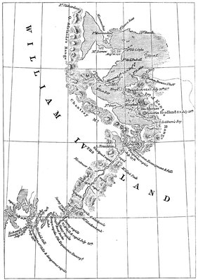 Searching for the ancient eastern settlement of the Norsemen, W. A. Graah, in 1829, wintered at Julianehaab, which in all likelihood is the site, although he knew it not. Possessed with the idea that it must be on the south-eastern coast, he devoted his attention to that region only, finding Eskimos who had never seen a white man and starting a trading intercourse which led to most of them migrating to the less inclement west. His work linked up with that of Scoresby, who in 1822 charted the main features of the sea-front from 69° to 75°. Ryder, seventy years afterwards, filled in the details of much of Scoresby's work, and found Eskimos further north, as Clavering had done in 1823, when in the Griper during Sabine's observations at Pendulum Island.