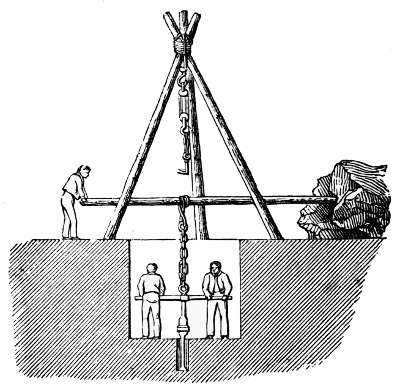 55. The lodes in the Cornish tin and copper mines are divided by shafts and galleries into rectangular compartments, called ‘pitches.’ These are open to the inspection of all the labouring miners in the county, and, by an admirable system, each ‘pitch’ is let by public competition, for two months, to two or four or more miners, who may work it as they choose. These men agree to break the ores, wheel them, raise them to the surface, and bring them (if desired) into a fit condition for the market. The ores so raised are sold every week, and the miner immediately receives his tribute, or percentage for which he agreed to work. The sinking of shafts and the driving of levels is paid by tut-work, or task work, at so much per fathom.