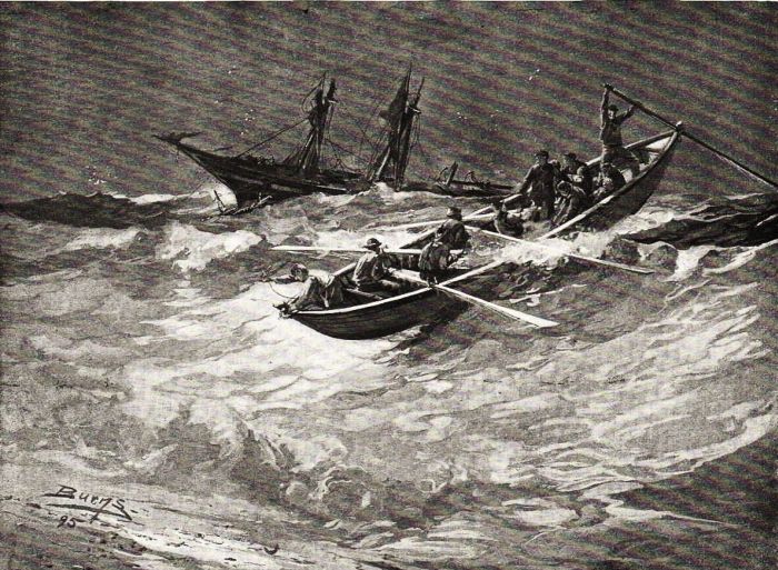 As soon as the whale-boat had her full complement of passengers, I among them, she was hauled astern of the ship, which was lying parallel to the shore, and pulled seaward. When about a hundred yards away, the men lay on their oars, and all waited anxiously for the dawn to reveal the full extent of the danger.