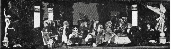 The most elaborate group exhibited was called "A Hunt Breakfast" (reproduced at the beginning of this article), representing the annual "meet," when the Duke of Beaufort and the Earl of Bathurst join in a fox-hunt, an event of great importance among English sportsmen. The group surround a breakfast-table spread with every eatable found on an English breakfast-table on a "meet" morning, the food, both in form and color, being an exact imitation. The men were dressed in hunting costumes, the Duke of Beaufort and his huntsmen wearing blue broadcloth coats with buff facings, while the Earl of Bathurst and the "Vale of White Horse" men wore pink broadcloth, the cloth being imported from England expressly for these tiny huntsmen. Both parties wore white twill hunting-breeches and high top hunting-boots, and the latter would have taxed the skill of a fairy's boot-maker. At a side table one of the hostesses was pouring tea, the tea-set being of Dresden china, decorated in pink and blue, the sportsmen's colors. The whole scene was duplicated in a three-panelled mirror at the back, which was twined with holly and evergreens. At either side of the room was arranged an English park scene. Pink water-lilies floated on tiny ponds, statues showed amid the shrubbery, and a background of evergreen gave the appearance of a real wood. This peep at the way English aristocracy amuses itself was originated and arranged by Mrs. Harry Hamlin, of Buffalo, whose husband takes an active part in the well-known Genesee Valley hunts, which were described a short time ago in Harper's Magazine.