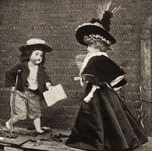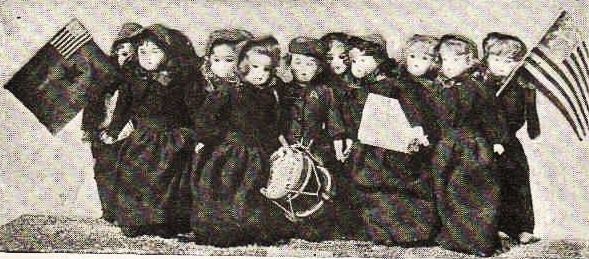 A more democratic gathering of dolls could hardly be imagined. They came in silks and velvets, in calicoes and muslins, in wools and in laces; they wore gorgeous Worth costumes, tailor-made gowns, and party, walking, and working gowns. Two came in bloomers, but seemed rather ashamed of themselves, and tried to hide behind a group of demure-faced nuns. There were newsboys, college-boys, Indian warriors, boy choristers, brave knights in shining armor, and solemn priests with gown and book. There were nurses in caps and aprons, milkmaids with milking stools and pails, Salvation-Army lasses, royal queens of England, and Quakers in soft gray gowns, with looks of mild astonishment at finding themselves in such a mixed company.