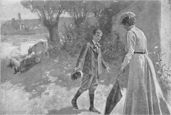 Here the singer's voice broke down, and I peered curiously around my corner of the wall. He was pacing to and fro on the river-bank—a weary-faced lad with pale cheeks and drooping shoulders. Beyond him a fat French footman lay asleep on the grass, one hand loosely clutching a novel. An elderly goat, grazing nearer and nearer the man, kept a wary eye on the book, and finally seizing it, devoured it leaf by leaf. At this the weary-faced boy did not smile, and then I knew there was something the matter with him.