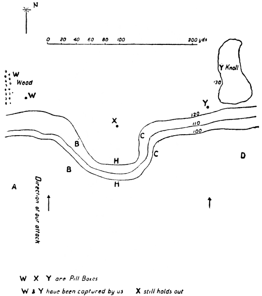 Our men following close behind the barrage took pill-boxes W and Y; but, partly owing to the conformation of the ground and partly for other reasons, we failed to take X, and this pill-box is now holding up the whole of our advance between W, wood, and Y, knoll, with a machine gun, which is being fired from the inside of the pill-box, and which sweeps the whole ground between these points so effectively that directly we attempt to advance our men are mown down.