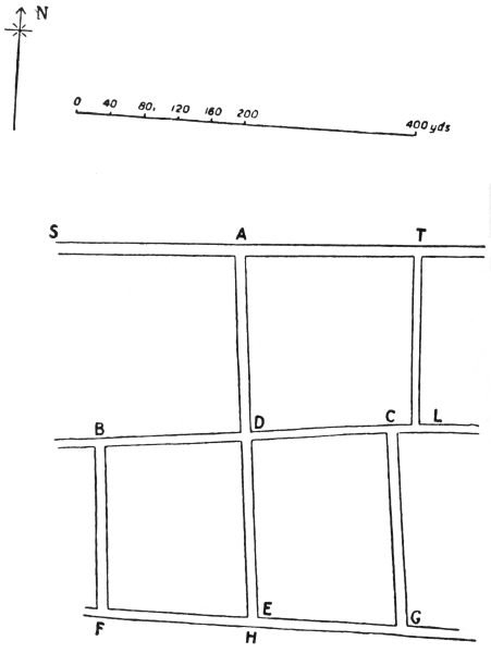 (b) Your men occupy the streets B D and D C, but no man can show his face in the street A H, which is covered by machine guns and snipers firing from near A, and all men attempting to cross the road at D have been shot. Several27 houses in the street B D have been knocked down by shell fire.