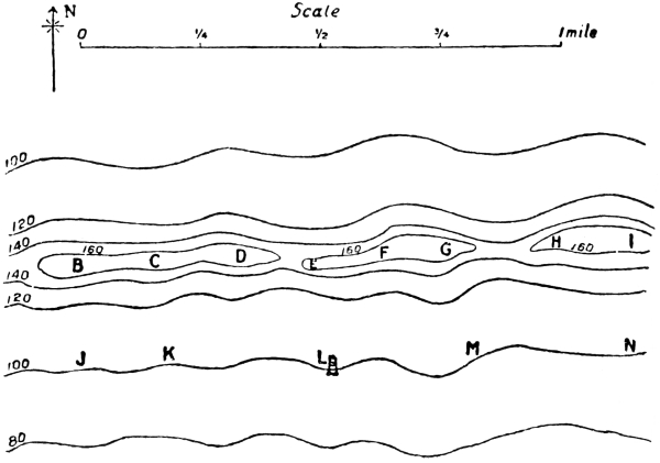 From the contours on the sketch, it is evident that the ground is convex in formation, that is, that it is nearly flat between X and H¹, but that it slopes rapidly between H¹ and H, between B¹ and B, and between C¹ and C.