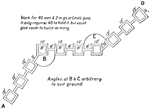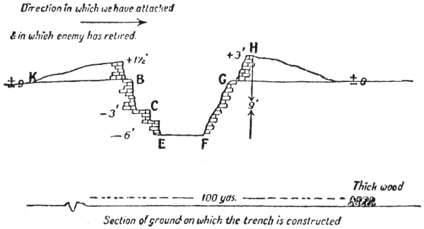 The company of which you are in command has succeeded in getting into a trench a section of which is given in the diagram. It has only incurred about 10 per cent. of casualties. The trench is the last of the German system, and there is a clear field of fire for about 100 yards in the direction in which the enemy has retired; after that there is a thick wood.