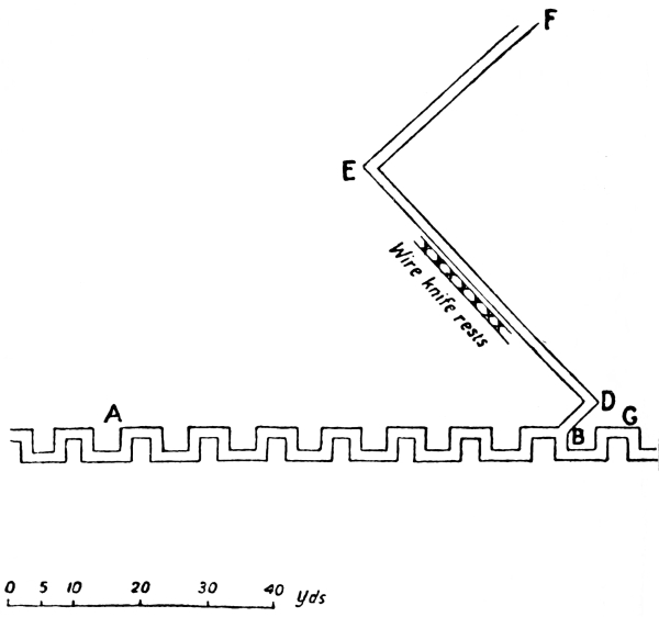 Pull knife-rests2 down into the trench D E F, also throw wire into it if available. At once put a couple of men at the point D to cover the trench D E with their rifles. As soon as you are able to do so, dig a short trench from G to D and place a Lewis gun at G to enfilade D E. You may have to wait until after dark before you 6869actually carry this out, but you should make arrangements for doing it by daylight. It would not be a bad plan to tie a few tins on to the knife-rests which you have thrown into the trench, so that the rattle, if they are moved, will give you warning of any one’s approach. The Lewis gun at G will be practically out of bombing range from E F.