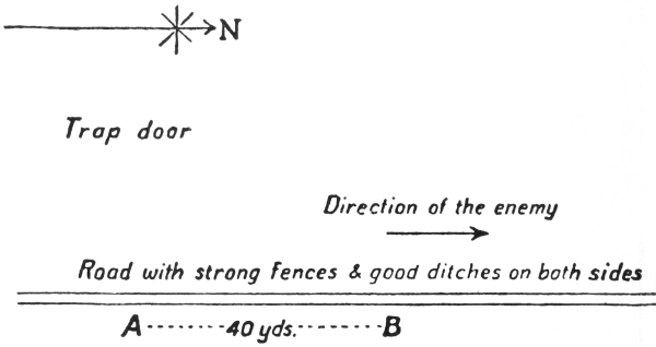 You are on outpost duty and have been told that the General is very anxious to get one or two live prisoners. Your picquet is at some cross-roads a quarter of a mile south of the road A B marked on the map. You have reason to believe that it is probable that the enemy will patrol down the road A B. A B is a good road with strong fences on either side of it, and with ditches on the road side of the fence.
