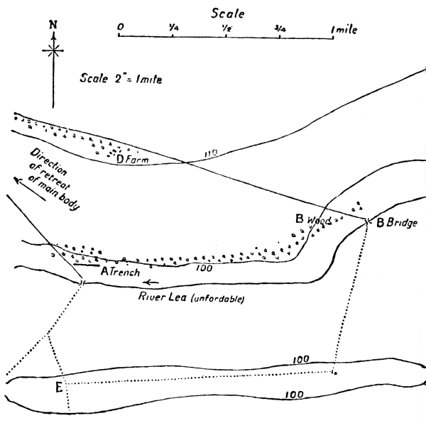 A force is retiring in a north-westerly direction. The River Lea shown on the map is unfordable. Two companies are acting as the point of the rearguard. Their orders are to hold the bridges at A and B. The bridge at B is to be held until 10 a.m. and the bridge at A until 10.30 a.m. If they can hold out until these hours, it is estimated that it will enable the main body to get away unmolested. The trees shown on the map are mostly oak, and are on an average forty feet high. The roads marked on the map are metalled and good. The farm buildings at D are strong. You are commanding B Company of your battalion, which is at B bridge, and90 are senior to Captain A., a reliable officer, who is occupying A trench just south of A wood. At 9.15 a.m. two scouts mounted on motor bicycles inform you that they have patrolled to the front and that none of the enemy are within three miles of you except a few companies near E, who are acting as support to an attack which is being made against A bridge. At 9.20 a.m. you receive the following message from Captain A., dated 9 a.m.: “Please do whatever you can to support me. I am being heavily shelled, and infantry are trying to push across A bridge. I fear that there is no chance of my being able to hold out until 10.30 a.m.”