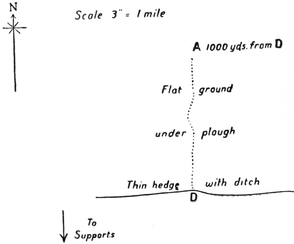 No. 4 Section with the Lewis gun will choose a position somewhere to the north of H, and on22 my signal will open a rapid fire on the loopholes of the pill-box at X. No. 3 Section will choose a position near B¹, and when the Lewis gun opens fire, they will open a rapid rifle-grenade fire on X. One minute after the Lewis gun has opened, No. 1 Section will rush in from C¹ and No. 2 Section from B¹.