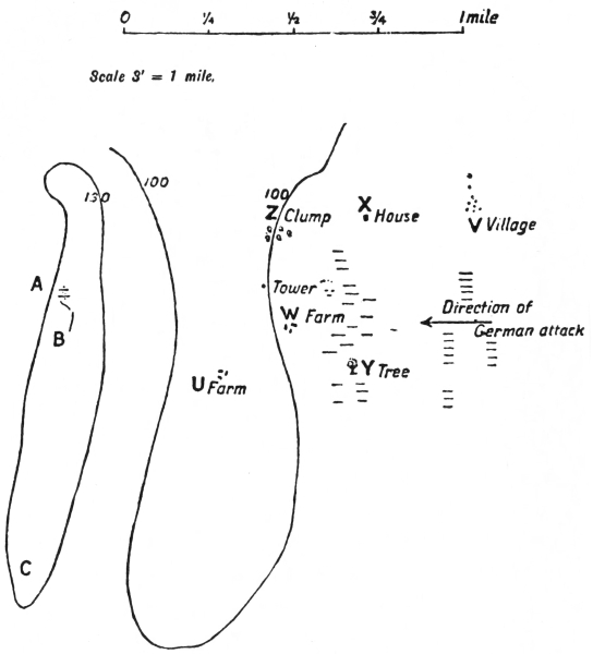 W, X, and Y are three pill-boxes about 150 yards apart. We are attacking in the direction20 of the arrows, that is, in a northerly direction.
