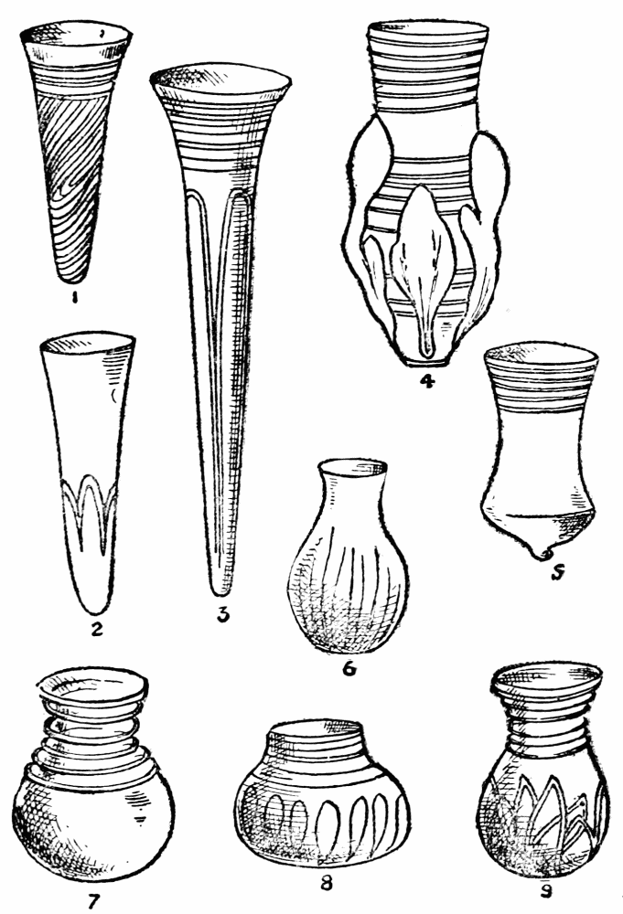 In Rome, however, the art of glass manufacture found a congenial home and was developed to a high pitch of excellence. So widespread was its use that it is a truism to say that in Rome of two thousand years ago glass was employed for a greater number of purposes—domestic, architectural, and ornamental—than it is to-day, even though the glazing of windows was in its infancy and the use of the material for optical purposes was scarcely known. In effect, coloured and ornamental glass held much the same place in the Roman household that china and earthenware do among us to-day. Glass was used for{4} pavements and for the external covering of walls. The Roman glass-workers were particularly happy in their combination of colours, both by fusing together threads of various colours, or by fusing masses, so as to imitate onyx, porphyry, serpentine, and other ornamental stones.