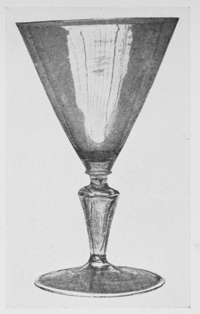 The art, thus brought to such perfection in Rome, naturally spread throughout Italy and the Roman colonies in France, Spain, Germany, and Britain. Probably workmen from the Italian cities also established the first furnaces among the lagoons of Venice, and so laid the foundation of what were to be the finest glass manufactories in the world. At the end of the thirteenth century a guild of glass-workers{5} was formed. These sequestered their craft upon the island of Murano, and there cultivated it with an increasing skill that in a brief space made Venetian glass the marvel of the civilised world. The peculiar merits of the Venetian product were grace of form and lightness of execution. Many of the vessels are surpassingly thin. The quality of the metal, however, leaves something to be desired. It is dull, frequently tinged with yellow—due to the presence of iron—or purple—the effect of too great a proportion of manganese. The workmen became so skilful that, carried away by the joie d’exécuter, they produced not only the artistic forms for which Venetian glass is famous, but all sorts of extravagances—ships, animals, birds, fishes, and so on—whose only merit was to testify to the excellence of a technique which could so triumph over the difficulties of form and material.