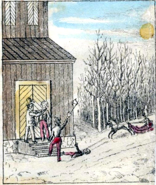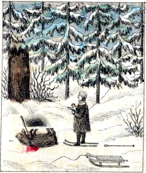 Puu-Pietari stod just i begrepp att sjelf nedhoppa från kyrktrappan, för att fullborda sitt elaka uppsåt, då han till sin förskräckelse hörde steg af kommande menniskor knarra på den nära landswägen. Till råga på mißödet gick månen i detsamma ur molnet och lyste med sitt klara hwita sken öfwer kyrkan och wägen och skogen och hela det wintriga snöklädda landskapet widt omkring. Hwad skulle nu Puu-Pietari företaga sig? Springa sin wäg? ingalunda, han skulle då genast upptäckts. Huka sig ned och krypa bakom kyrkmuren? Ja, det hade kunnat låta göra sig, om fattiggubben stått qwar på sin plats. Men nu låg han med näsan platt i snödrifwan bredwid trappan och, när månen sken så klart, måste man från wägen wid första ögonkastet upptäcka att fattiggubben war sin kos. Pietari wißte i hastigheten ej bättre, än att ställa sig sjelf på fattiggubbens wanliga plats uppå trappan och, likasom han, sträcka ut handen mot landswägen. Stor sak om kostymen ej är precis lika, tänkte skälmen inom sig; det är ändå ej så ljust, att man urskiljer det från wägen, och jag agerar fattiggubbe 33ett par minuter, tills de der junkarena paßerat i allsköns ro förbi.