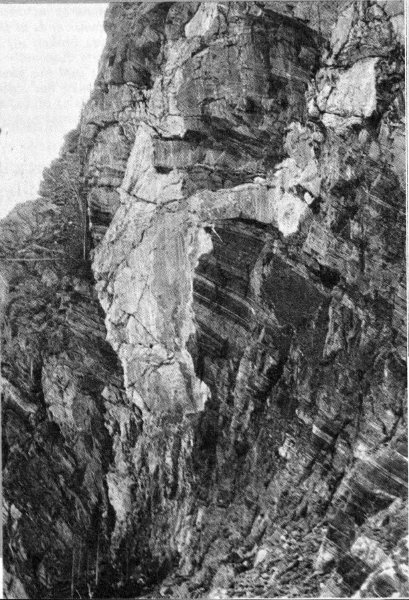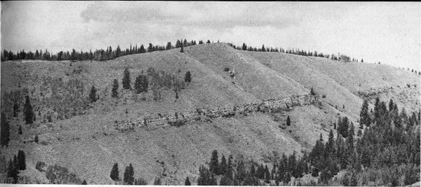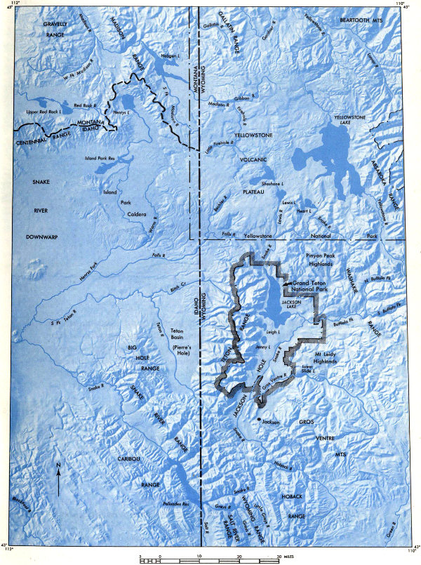 About a million motorists drive south from Yellowstone to Grand Teton National Park each year. As they wind along the crooked highway on the west brink of Lewis River Canyon (fig. 1), the view south is everywhere blocked by dense forest. Then, abruptly the road leaves the canyon, straightens out, and one can look south down a 3-mile sloping avenue cut through the trees. There, 20 to 30 miles away, framed by the roadway, are the snow-capped Tetons, with Jackson Lake, luminous in reflected light, nestled against the east face. This is one of the loveliest and most unusual views of the mountains that is available to the motorist, partly because he is 800 feet above the level of Jackson Lake and partly because this is the only place on a main highway where he can see clearly the third dimension (width) of the Tetons. The high peaks are on the east edge; they rise 7,000 feet above the lake but other peaks and precipitous ridges, progressively diminishing in 20 height, extend on to the west for a dozen miles (fig. 14). Giant, relatively young lava flows, into which the Lewis River Canyon was cut, poured southward all the way to the shore of Jackson Lake and buried the north end of the Teton Range (figs. 13 and 53). South of Yellowstone Park these flows were later tilted and broken by the dropping of Jackson Hole and the rise of the mountains.