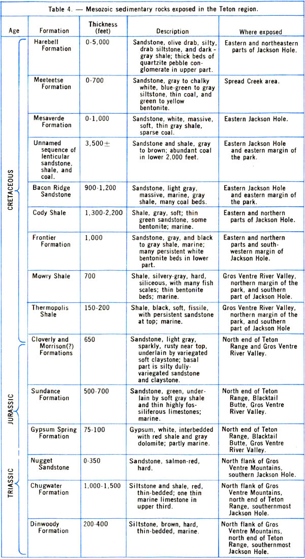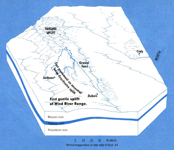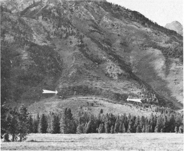 Conspicuous on the eastern and southeastern skyline are high-level (11,000-12,000 feet) flat-topped surfaces on both the Wind River and Absaroka Ranges. These are remnants that mark the upper limit of sedimentary fill of the basins adjacent to the mountains. A plain once connected these surfaces and extended westward at least as far as the conspicuous flat on the mountain south of Lower Gros Ventre Slide. It is difficult to imagine the amount of rock that has been washed away from between these remnants in comparatively recent geologic time, during and after the rise of the Teton Range.